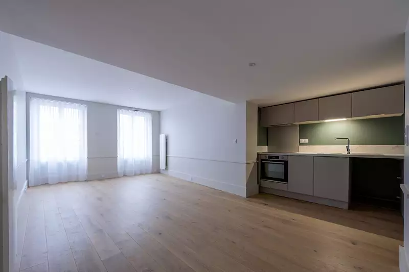 d'une pièce de vie lumineuse de 32 m² comprenant un séjour et une cuisine aménagée et équipée,