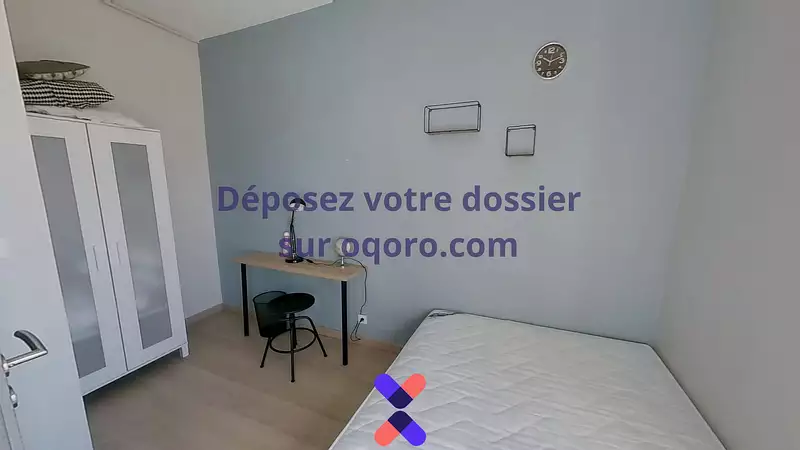 La chambre est meublée d'un lit double, d'un bureau avec chaise de bureau et d'un grand placard de rangement.