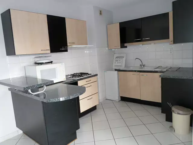 ONET LE CHÂTEAU : T3 lumineux comprenant hall d'entrée avec placard, séjour/salon avec balcon, cuisine américaine aménagée et équipée (placards hauts et bas, bar, hotte aspirante, plaque de cuisson, four, lave-linge), salle d'eau, WC indépendant, 2 chambres dont 1 avec placard. Annexes : 1 garage et 1 cave Chauffage gaz VGR