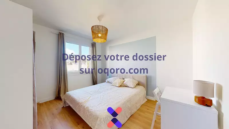 Cette chambre, la plus grande de l'appartement, est équipée d'un lit double, d'un bureau, d'une chaise et d'un meuble dressing.