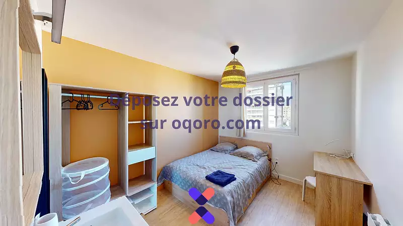 La chambre est équipée d'un bureau, d'un lit et d'une penderie.