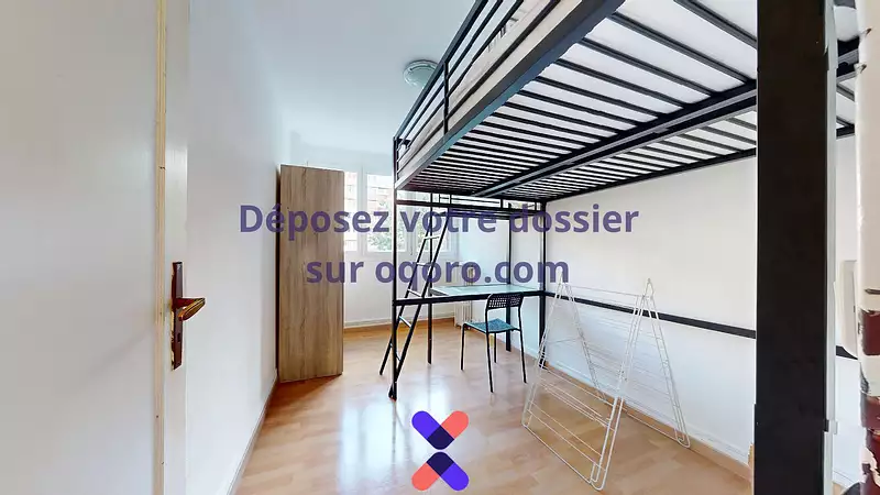 La chambre comporte un lit double en mezzanine avec bureau intégré, ainsi qu'un placard de rangement.