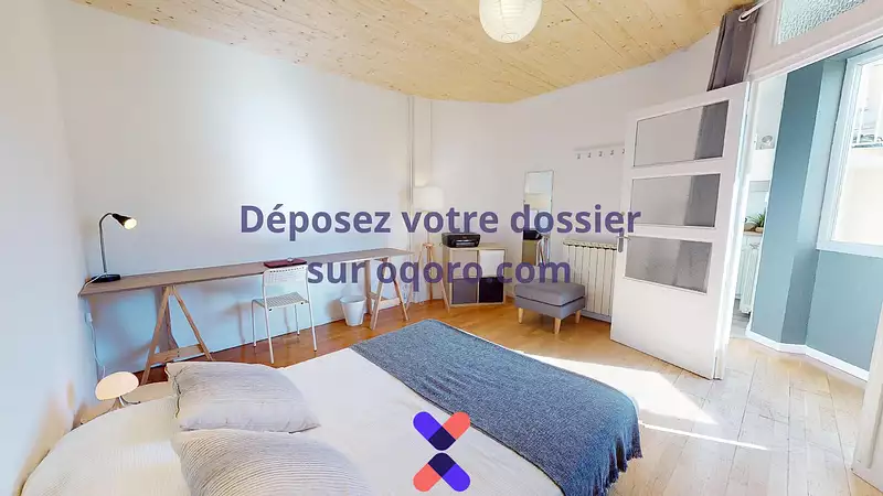 Mobilier: composé d’un lit double, d’une belle table de nuit avec une lampe de chevet, d’un grand plateau pour le bureau et d’une lampe de bureau ainsi qu'un grand luminaire, un placard avec deux hauteurs de penderie et un rideau qui sert à occulter les étagères. Un petit pouf complète le tout.