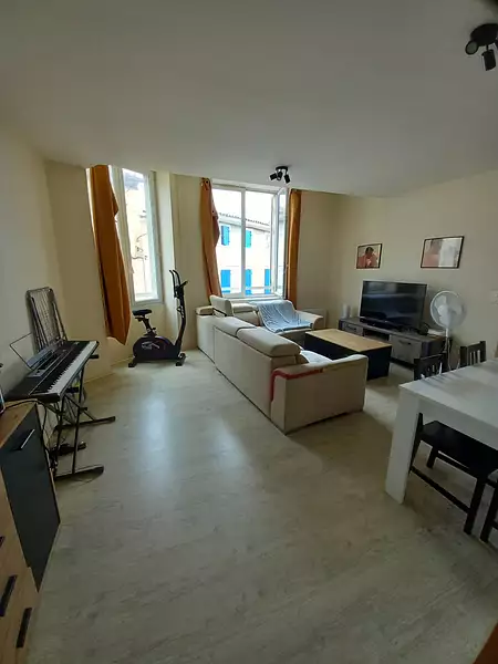 Appartement T3 situé au coeur du centre ville de Langon, il se situe dans un immeuble sécurisé et au 1er étage, il se compose d'une pièce de vie ouverte sur le coin cuisine, avec placards et hotte, un cellier, deux chambres avec placard, et une cave.