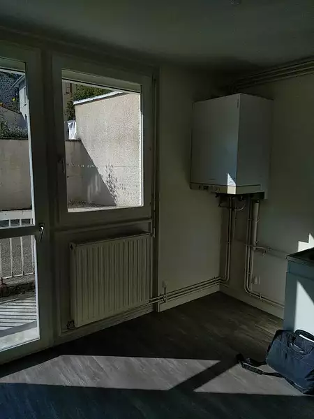 A louer dans petite résidence à proximité du centre d'Usson En Forez, appartement 3 pièces au RDC de 67 m²: séjour, cuisine fermée avec balcon, deux chambres, SDB avec douche, WC séparés, cellier et cave, chauffage individuel gaz propane.