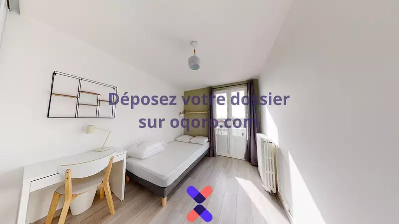 Équipements : un lit double, un bureau, des étagères murales et un placard intégré pour ranger ses vêtements.