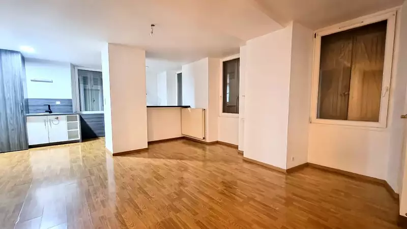Ce bien se compose d'un espace de vie traversant et lumineux, avec salon/séjour et cuisine aménagée et équipée (four, hotte, plaque de cuisson) ouverte pour une atmosphère conviviale et moderne.