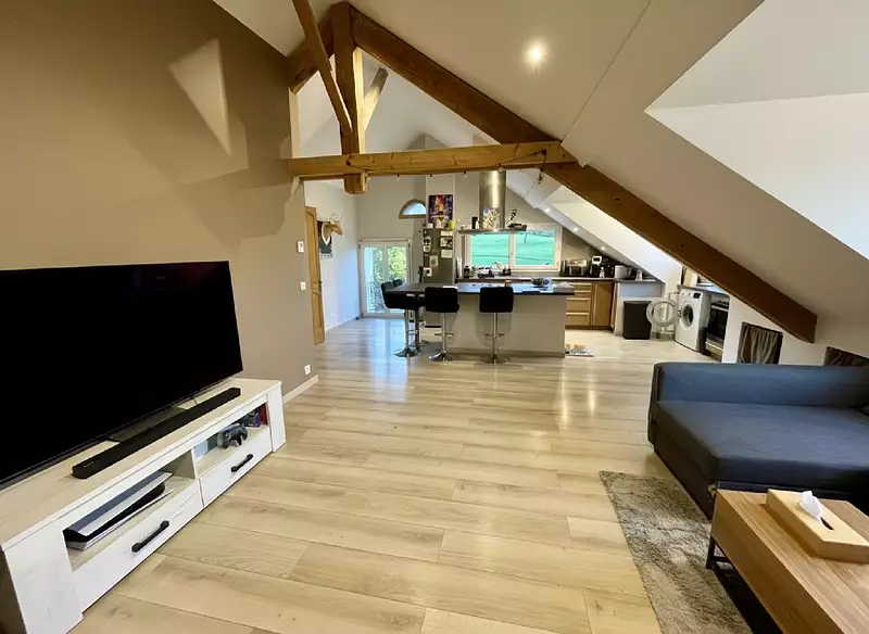 MINZIER - 15 min Viry, , Bel appartement de type 3 de 68 m2 situe au premier etage d'une maison entierement renove avec gout et materiaux de qualite., , Une belle piece de vie avec cuisine equipee ouverte sur salon sejour avec poele a bois. Deux chambres. Salle de bain avec baignoire et douche. 2 places de stationnement. , Disponible de suite. 1 mois de caution. Garant demande.