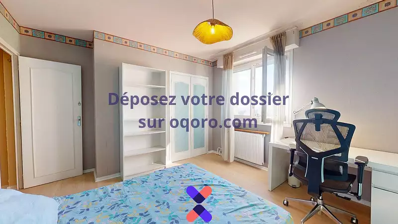 La chambre est spacieuse et lumineuse. Elle est entièrement meublée et équipée pour votre confort : lit double, bureau, armoire et table de chevet.