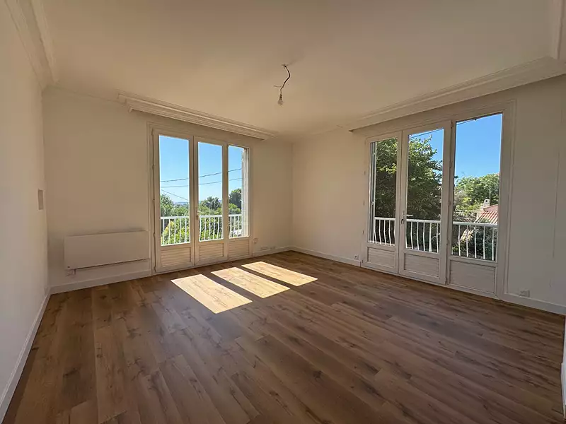 MARSEILLE 12ème arrondissement. Quartier BOIS-LUZY. 1er étage de maison, appartement type de 69 m² entièrement rénové (sols, murs, électricité, menuiseries etc ....) jamais loué, comprenant un grand séjour avec accès balcon, cuisine indépendante aménagée, 2 chambres, salle d'eau, wc. Appartement lumineux entièrement parqueté. Jardin. Proximité écoles et collège.