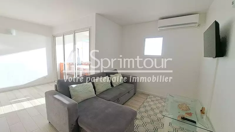Niveau principal : un salon-séjour spacieux lumineux, idéal pour créer un espace de vie convivial, un dégagement aménagé en coin bureau, une cuisine ouverte sur le séjour, un balcon avec vue mer.