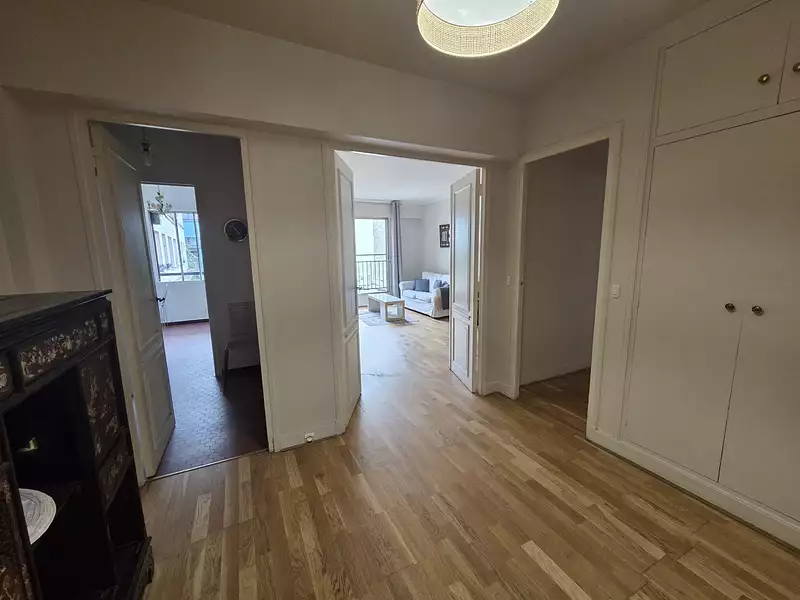 Dans un bel immeuble avec gardien et ascenseur, un appartement 2 pièces de 72,30 m² loi Carrez, donnant sur le jardin de la copropriété. Il est composé d'entrée avec placards intégrés, séjour sur le jardin, cuisine équipée indépendante, grande chambre, salle de douche avec wc, plus 2e wc indépendant avec lave mains.