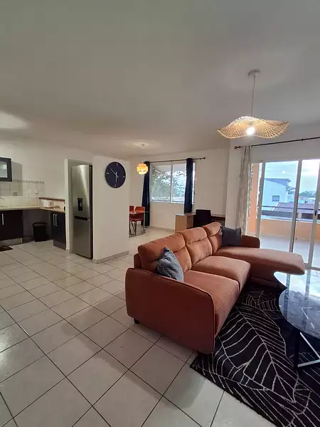 Grand Appartement T3 LUMINEUX entièrement MEUBLé ET CLIMATISé dans une résidence sécurisée à l'entrée du centre ville de Cayenne, d'une surface habitable de 73m2 comprenant 1 sejour salon climatisé ouvert sur une vaste terrasse, une cuisine aménagée, un dégagement, deux chambres climatisées avec placards , une salle de bain, un wc indépendant