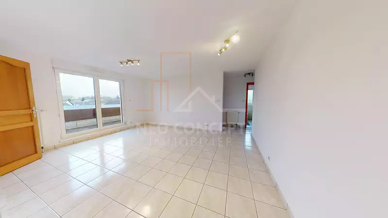 À louer, appartement de 3 pièces d’environ 73 m² habitables, situé au dernier étage d’une résidence calme et bien entretenue. Il dispose d’un balcon de 10 m², d’une place de parking, d’une cave ainsi que d’un grand garage.