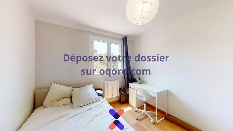 Le salon est agréablement décoré grâce à ses meubles étagères accompagnés de plantes et se munit d’un canapé, d’un tapis de sol, d’une table basse, d’un meuble TV et sa TV, d’une table à manger avec chaises et enfin d’un agréable balcon avec une vue dégagée et arborée. La salle de bain du logement est commune et dispose d’un double meuble vasque et d’une douche. Un WC indépendant se trouve accolé à la salle de bain. Les chambres sont similaires et disposent toutes d’un lit double, d’un bureau et de plusieurs rangements.