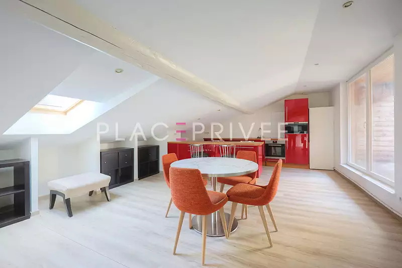 Nancy, Place d'Alliance - Loue appartement meublé avec terrasse. Sous les toits d'un immeuble d'angle du XVIIIe siècle, dans le carré d'or de Nancy, un appartement se cache comme un secret bien gardé, face à la célèbre place d'Alliance. Classée au patrimoine mondial de l'UNESCO, cette place dessinée par Emmanuel Héré à la demande du roi Stanislas rend hommage à l'alliance entre la France et l'Autriche. Plus intime que sa voisine la place Stanislas, elle séduit par son harmonie classique, son bassin orné de trois naïades et l'élégance paisible de ses façades dorées par le temps. C'est ici, au quatrième et dernier étage sans ascenseur, que se niche ce logement de 75 m² au sol (38,95 m² Carrez), lumineux et d'une douce modernité. Sous les poutres blanchies, une vaste pièce à vivre se déploie autour d'une cuisine ouverte, équipée et aménagée, où les teintes rouges répondent à la chaleur du bois clair. Une porte-fenêtre s'ouvre sur une terrasse à l'abri des regards, de près de 7 m². La chambre, spacieuse, prolonge cette atmosphère apaisée avec sa salle d'eau attenante, habillée du même rouge profond. Un WC séparé, de nombreux rangements et la climatisation réversible complètent cet ensemble rare où confort contemporain et cachet ancien dialoguent avec naturel. Un appartement singulier, pour vivre Nancy depuis son coeur historique, à deux pas de la place Stanislas et de toutes les adresses que l'on aime. Charges prévisionnelles : 40.00 euros Fibre optique disponible. Libre de suite - Une exclusivité Place Privée. Les informations sur les risques auxquels ce bien est exposé sont disponibles sur le site Géorisques : www.georisques.gouv.fr