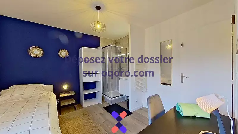 La chambre est dotée d'un lit simple, un dressing, une étagère, une commode de chevet et un bureau. Le plus : une salle de bain privative (douche, meuble vasque avec miroir et sèche-serviette).