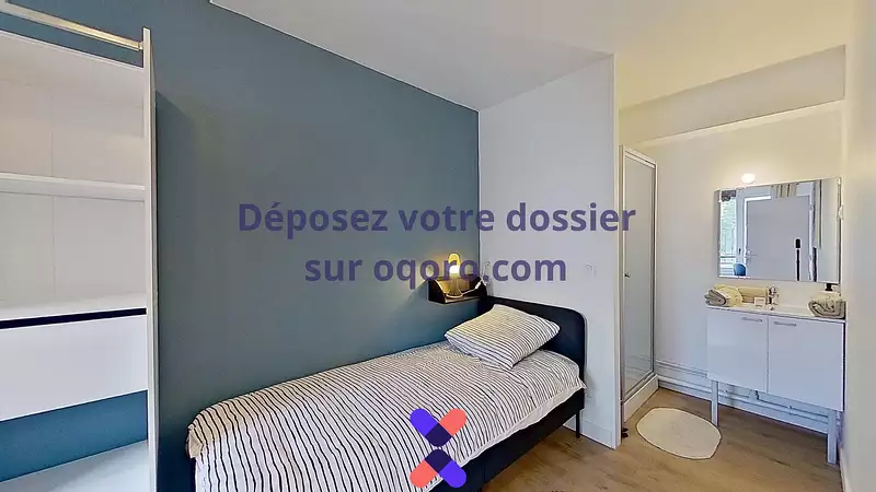 La chambre est équipée d'un lit simple, d'un bureau ainsi qu'une chaise et d'une penderie.