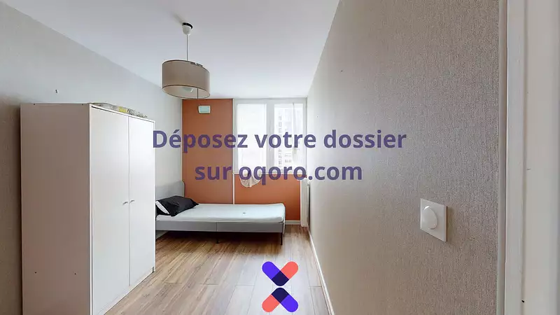 Cette chambre dispose d’un lit simple, d’une armoire de rangement et d’un joli sol en parquet qui apporte une touche chaleureuse. Les murs aux tons modernes, dont un mur coloré, créent une ambiance agréable.