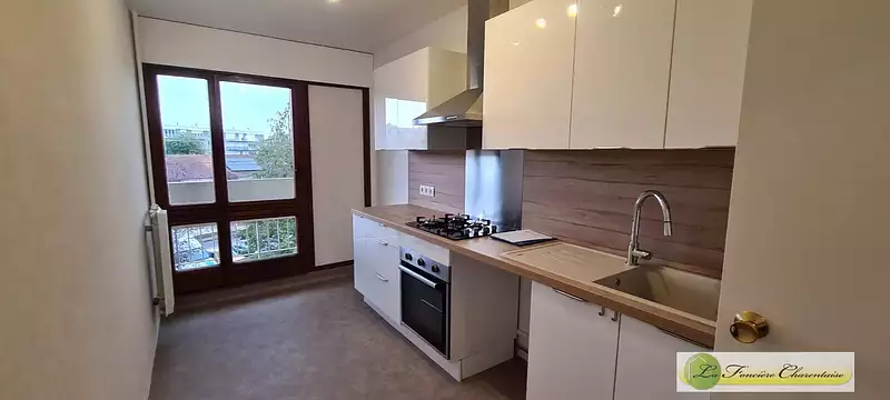 Dans résidence avec ascenseur, parking et cave, appartement type 4 (78 m²) entièrement rénové comprenant entrée, cuisine semi-équipée (four, plaques gaz et hotte), double séjour avec balcon, 2 chambres, 3 celliers, salle d'eau et wc. CHAUFFAGE ET EAU COMPRIS.