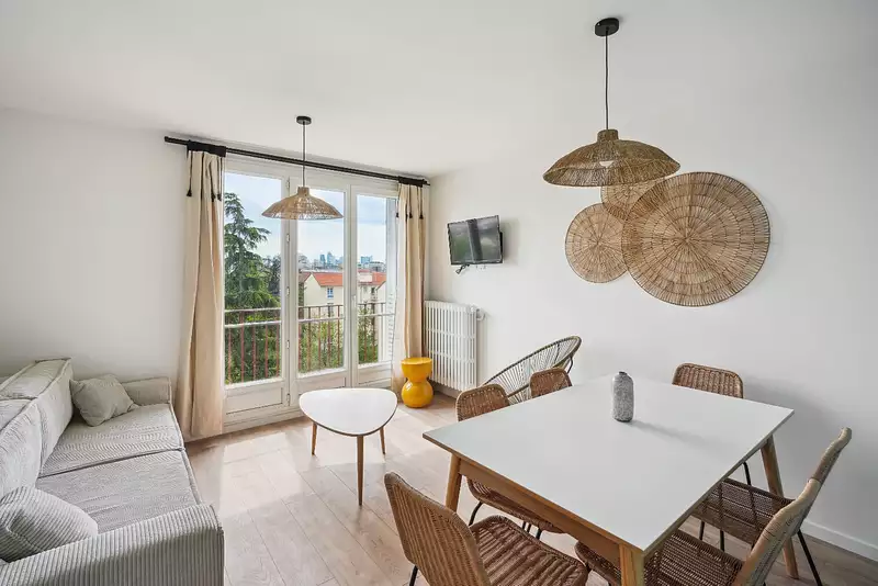 Un séjour lumineux avec cuisine ouverte, aménagée et équipée, donnant sur un balcon,
