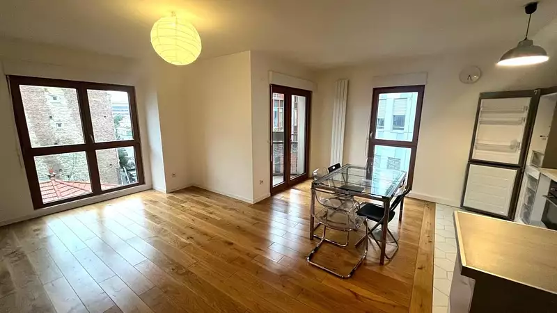 Entrée, grand séjour de 30m² avec cuisine américaine aménagée et équipée, 3 vraies chambres, salle de bains, salle d'eau, wc, balcon et parking en sous-sol.
