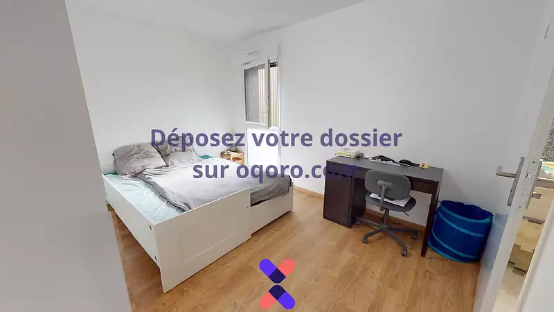 Cette chambre est équipée d'un lit double, d'une armoire, d'un bureau, d'une chaise et d'un accès à une salle de bain privative (douche, meuble vasque).