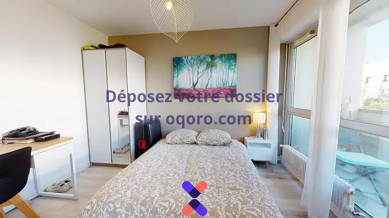 La chambre 1 offre tout le confort nécessaire, elle dispose d'un lit double, d'un bureau, d'une chaise et d'un placard pour ranger ses affaires. De plus elle donne l'accès au balcon filant, accessible également depuis le salon.