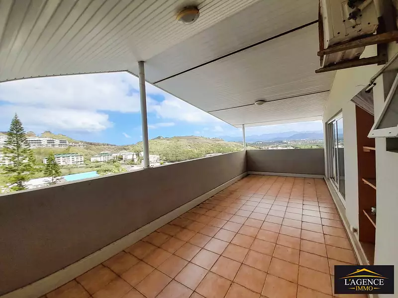 Sur les hauteurs de Porte de Fer, dans une résidence sécurisée, appartement F3 d'une superficie de 85m² comprenant une cuisine semi équipée, un vaste séjour, deux chambres avec placards dont une climatisée, une salle d'eau, un WC indépendant et une grande terrasse couverte de 24m² offrant une belle vue dégagée.