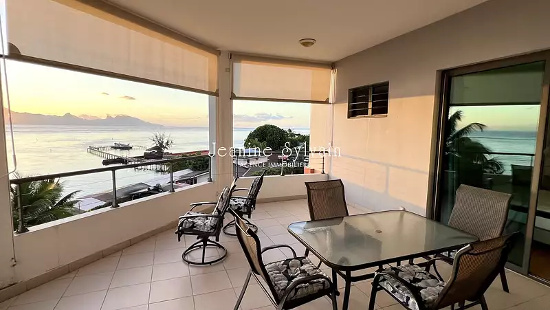 Vue mer et Moorea imprenable, bel F4 de 93 m2 habitables de très bon standing, très lumineux proche commerces et écoles, meublé et équipé, 2 chambres climatisées, 1 bureau, 2 salles d'eau, séjour, cuisine, terrasse couverte de 24 m2.