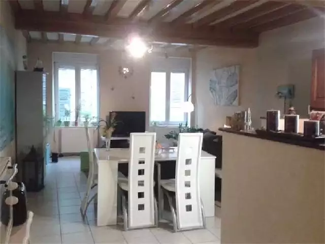 Au coeur du village, logement rénové situé au 1er étage composé d'un séjour/coin cuisine meublé et partiellement équipée (hotte et plaque de cuisson), 3 chambres, salle de bains, wc, buanderie.