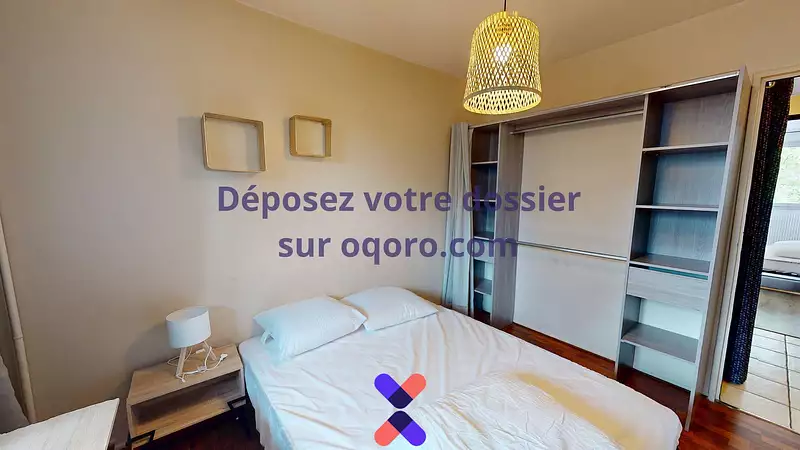 La chambre est équipée d’un lit double, d’un bureau, d’un placard de rangement ainsi que d’étagères pour un maximum de confort.