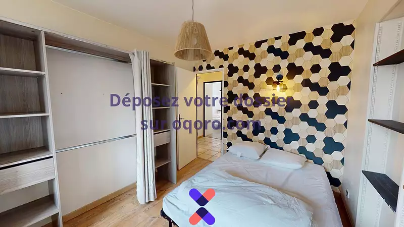 La chambre est équipée d’un lit double, d’un bureau, d’un placard de rangement ainsi que d’étagères pour un maximum de confort.