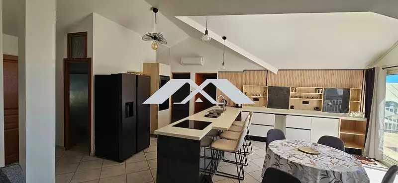 Une cuisine ouverte entièrement équipée s'ouvre sur un vaste séjour et une salle à manger conviviale, parfaits pour recevoir.