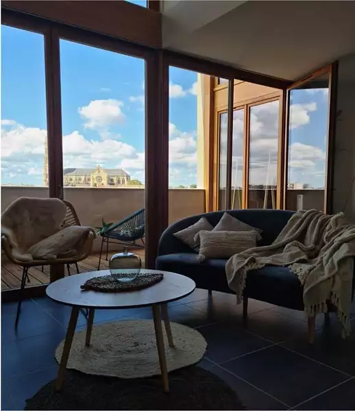 - au RDC d'une belle pièce de vie avec cuisine ouverte, donnant sur un grand balcon avec vue sur tout BORDEAUX, une chambre 1 avec WC et Salle d'eau privés,