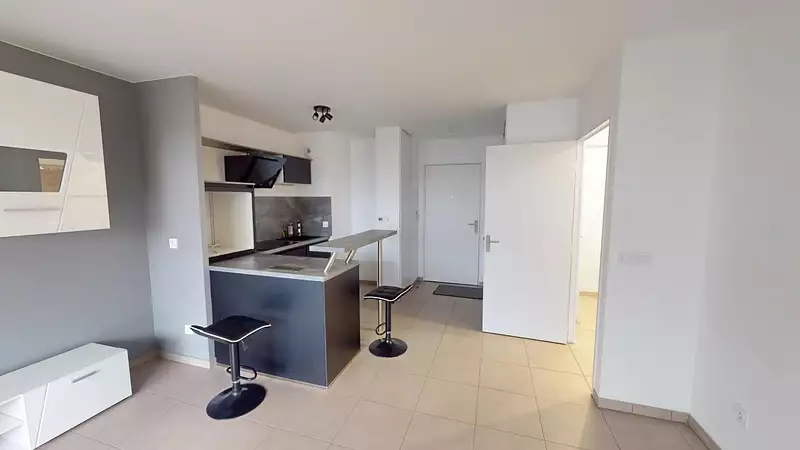 Le hall d'entrée vous donne accès à une cuisine équipée et meublée moderne ouverte sur un séjour lumineux (totalité de l'ensemble 23.57m²) et vous offre une vue sur un balcon de 5.7m². Cet espace vous permettra de profiter pasiblement de l'extérieur à l'opposée de la rue Gabriel Peri.