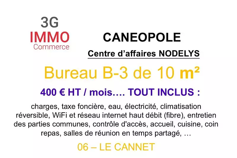 CANEOPOLE - LE CANNET. Centre d'Affaires NODELYS - Bureau B-3 de 10 m² rénové. Location avec prestations.