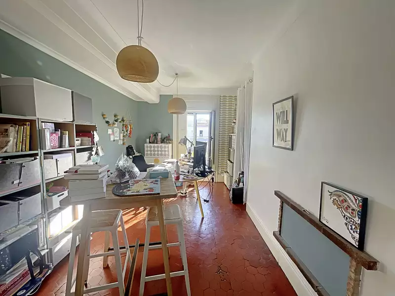 À l’étage un espace pouvant servir de stockage ou de bureau supplémentaire et un grenier. Balcon filant avec vue dégagée sur les toits, rangements intégrés, luminosité traversante.