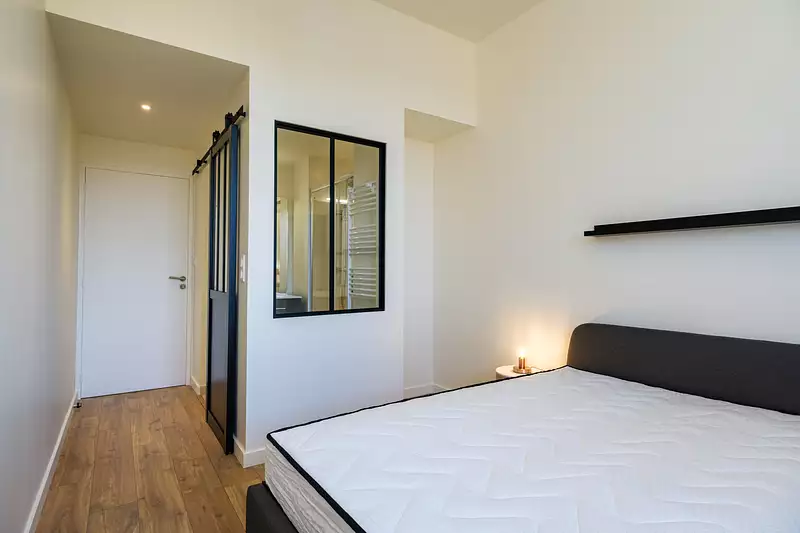 3 chambres se situent au 1ème étage et 2 chambres au 2ème étage. Elles font toutes 15m2 et beneficient toutes de leur salle d'eau privative avec douche à l'italienne, lavabo et wc. Chaque chambre a un bureau et du rangement. Les chambres côté rue sont exposées ouest, celles coté cour exposées Est. Isolation en laine de bois.+