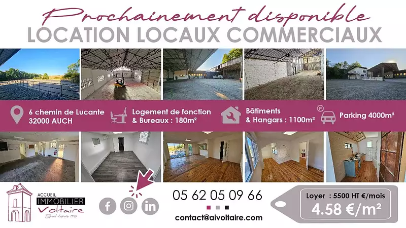 Découvrez une opportunité rare sur le secteur d’Auch : des locaux commerciaux complets, prêts à accueillir votre activité, avec bureaux, logement de fonction et plus de 1 100 m² d’ateliers, le tout sur un vaste terrain avec 4 000 m² de parking !