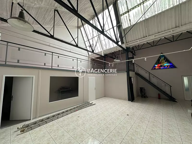 À l'étage, une mezzanine surplombe l'atelier, apportant une belle hauteur sous plafond et un volume appréciable. Plusieurs bureaux fermés sont également disponibles, offrant des espaces de travail distincts et adaptés à différents besoins.