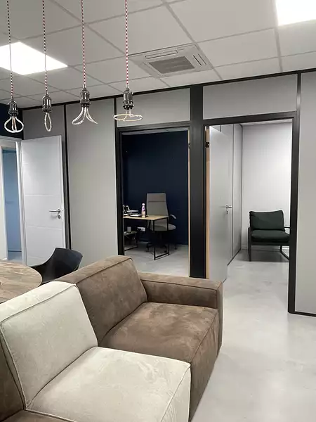 Zone Pole 2000, proche des grandes enseignes, au 1er étage d’un bâtiment, bureaux meublés et décorés de 38m2 environ composé d’une grande pièce et de 2 bureaux fermés. Jouissance non exclusive d’équipements communs aux différents occupants, à savoir, des sanitaires, une cuisine et un accueil.
