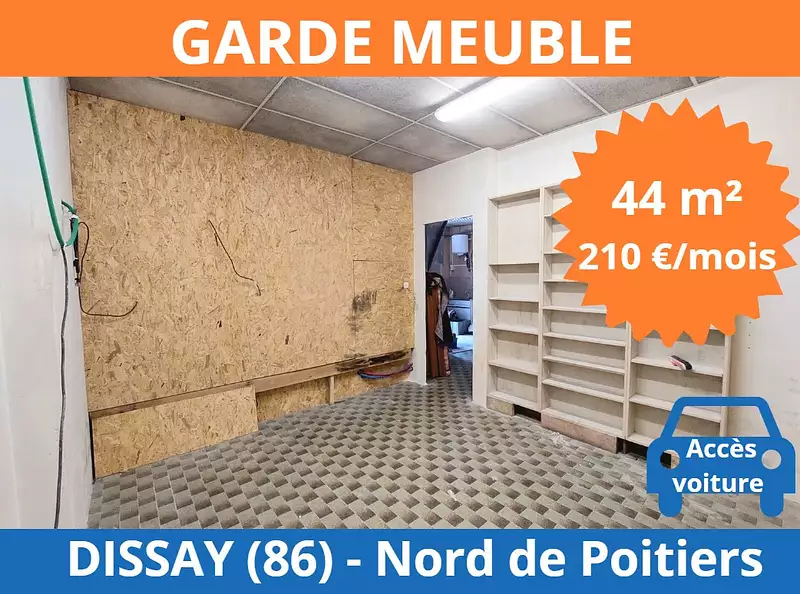 Vous cherchez un garde meuble ? L'agence Novio vous propose ce local de stockage de 44m2, comprenant 2 pièce. Il est situé dans la zone d'activité de Dissay, avec un accès facile depuis la D910. Vous pourrez reculer votre véhicule jusqu'à la porte du local, afin de faciliter la manutention de vos meubles. Largeur de la porte d'accès : 84 cm Ce garde meuble vous est proposé au prix de de 210? par mois charges comprises (200 ? de loyer TTC et 10 ? de charges, TVA récupérable, soit 175 ? HT pour les professionnels) Frais de dossier et bail : 400 ? forfaitaires à charge preneur Les informations sur les risques auxquels ce bien est exposé sont disponibles sur le site georisques.gouv.fr. Retrouvez tous nos biens disponibles sur notre site internet : REF : 0243 - SUPERI_1765274117