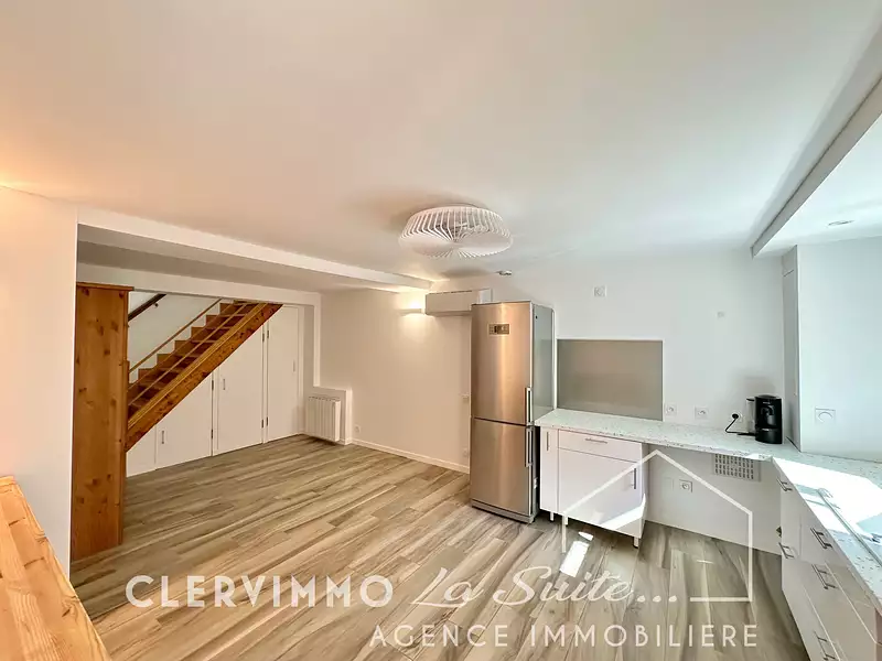 -au-rez-de-chaussée : une cuisine ouverte et équipée (plaque, hotte, réfrigérateur) sur un espace de vie d'environ 20-25m2 avec rangements.