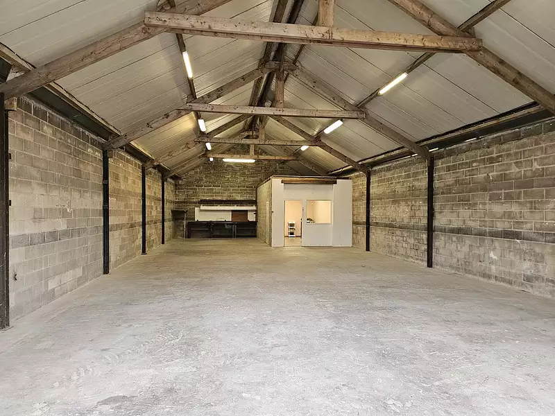 Hangar d'environ 190 m2 en très bon état d'entretien avec rideau métallique motorisé comprenant un bureau, un WC et une cour fermée.