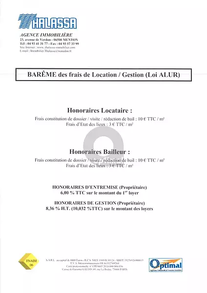BAREME HONORAIRES AGENCE THALASSA : TRANSACTION - LOCATION - GESTION.