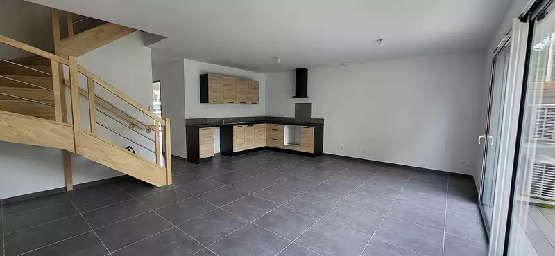 Maison NEUVE de 5 pièces sur 2 niveaux comprenant au RDC : entrée, WC, séjour avec cuisine américaine (meubles, plaque et hotte), cellier, une suite parentale avec SDD,. A l'étage : 3 chambres, salle de bains avec baignoire et douche, WC. Jardin avec terrasse. 2 emplacements de parking Chauffage CLIM et convecteurs. Libre de suite. Candidature soumise à garantie loyers impayés.
