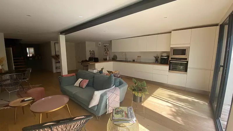 Elle comprend au rez-de-chaussée, une pièce de vie avec cuisine ouverte entièrement équipée donnant sur le jardin avec une terrasse, un dressing, des toilettes et une buanderie.