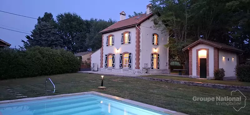 REF : 2737 : A LOUER Ancienne maison du chef de gare d'Esparron de pallières , cuisine indépendante aménagée, séjour cheminée, salon, grande salle d'eau avec wc et placard, wc indépendant, buanderie, 4 chambres dont une chambre avec salle d'eau , cave, terrasse, piscine, poolhouse( douche , wc , lavabo) sur 2300 m2 de jardin loyer 1990 euros dont 100 euros de charges pour les om, entretien piscine, eau Honoraires à la charge du locataire : 697 euros dont 190 euros pour l'état des lieux