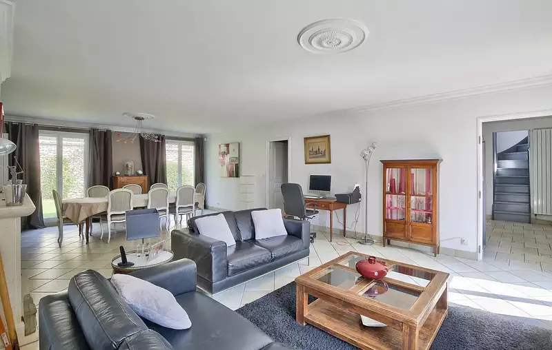 NOISY-LE-ROI - Dans un cadre verdoyant, calme et à proximité à pied des commerces, école et Ligne Tram 13 - Belle maison de 211 m² - 7 pièces comprenant : une grande entrée - un grand séjour/salle à manger équipé d'une cheminée, lumineux avec sa double exposition donnant accès à une terrasse et jardin sans vis-à-vis. Une cuisine indépendante aménagée et équipée avec accès vers l'extérieur. Un espace en mezzanine pour un coin lecture ou bureau. Une chambre et salle de douche avec wc complètent ce niveau.